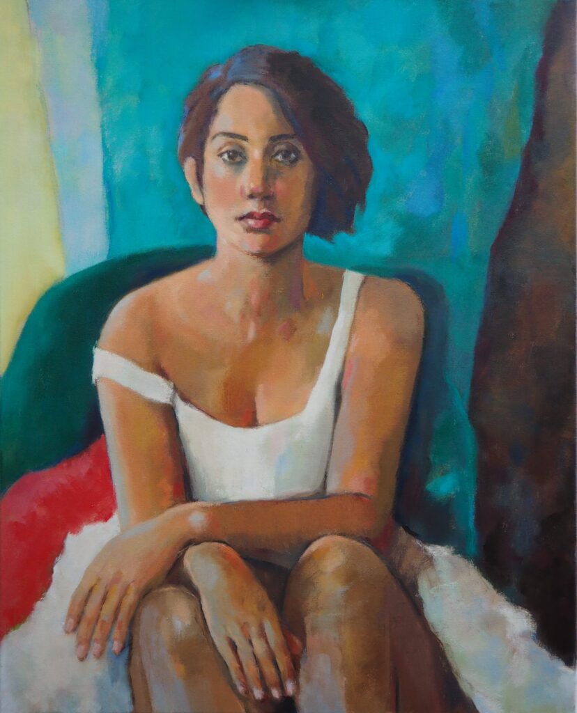 Beatrice in white dress. 2026. Oil on canvas. 76x61cm