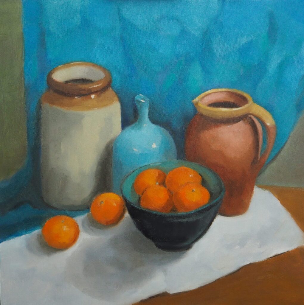 Still life with ceramics & satsumas. 2026. Oil on canvas. 50x50cm