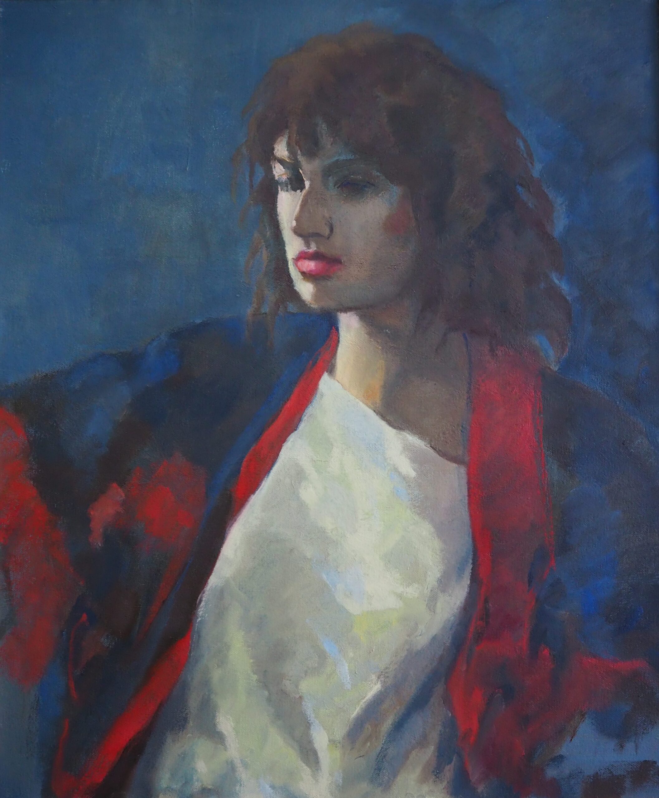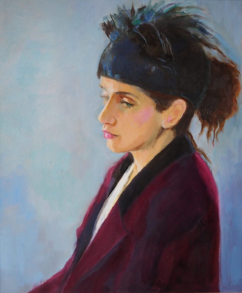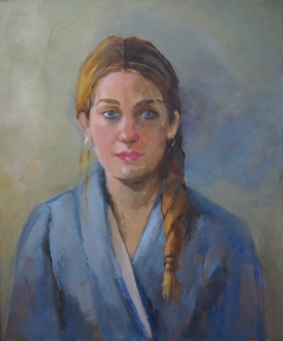 Beatrice in blue scarf. 2018. Oil on canvas. 24"x20", 61x51cm